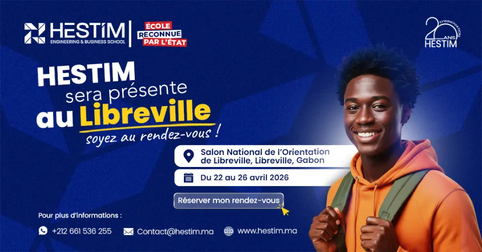 À l’occasion de la troisième édition du Salon National de l’Orientation au Gabon, l’équipe HESTIM sera présente à Libreville du 22 au 26 avril 2026 pour rencontrer les lycéens, étudiants et parents, répondre à leurs questions et les accompagner dans la construction de leur parcours académique.
